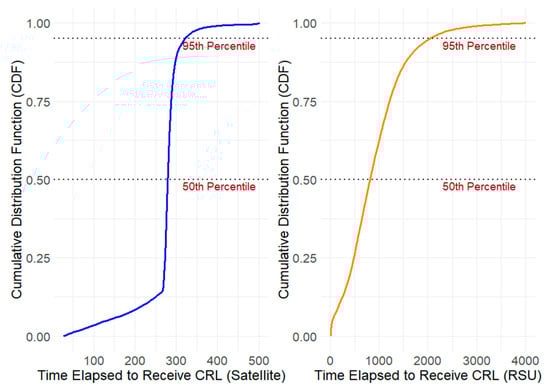 Cumulative distribution functions for CRL delivery via satellite vs. RSU in Tampa, Florida, United States.