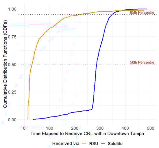Cumulative distribution functions for CRL delivery via satellite vs. RSU within downtown Tampa, Florida, United States.