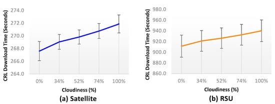 Impact of cloud cover on (a) satellite and (b) RSU CRL download times.