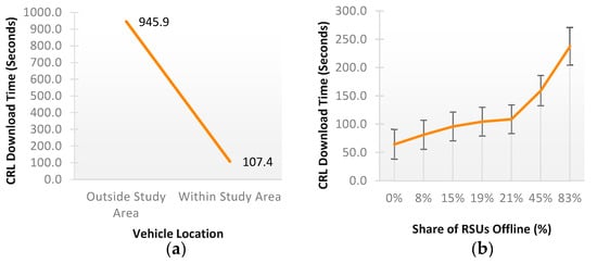 Impact of (a) RSU infrastructure on CRL download times and (b) RSU operational efficiency on CRL download times.