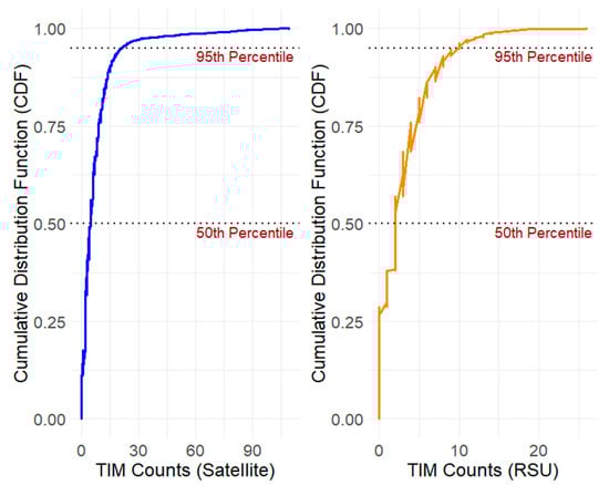 To get a more comprehensive overview of satellite and RSU TIM broadcasting, Figure 11 displays the CDF. The data show that satellite delivers TIMs at higher rates than RSUs. At the 50th percentile of the distribution, satellite delivery dispatches up to seven TIMs, while RSUs deliver approximately two TIMs. Beyond the 95th percentile, satellite dispatches up to 21 TIMs compared to only 10 delivered by RSUs to the end users. This highlights the critical role of satellite augmentation in rural and more dispersed V2X environments.