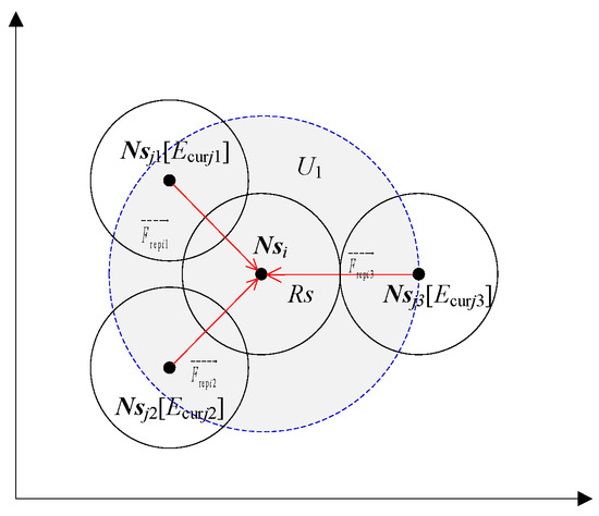 The distance between sensor nodes within communication range 0 < dist(Nsi,Nsj) < 2Rs; thus, the area of sensing overlap will be formed. In order to avoid over-densification of nodes and improve node coverage utilization, the virtual repulsion force, denoted as , between nodes is defined to guide the neighbor nodes away from each other. The closer the distance between node Nsi and node Nsj, the higher the virtual repulsion force is.