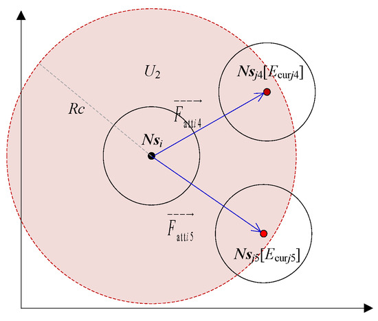 Based on the above analysis, the less residual energy of the nodes within the communication range, the greater the virtual attractive force. Similarly, the greater the distance between nodes, the greater the virtual attractive force. Therefore, in the Nsi gravitational field U2 defined by Equation (13), the virtual attractive force on Nsi is calculated by Equation (14):