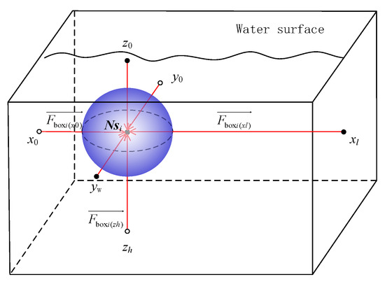 In UWSNs, the boundaries of the monitoring area have a great impact on the coverage utilization of nodes. In order to improve the effectiveness of hole recovery with a limited number of additional nodes, based on Hooke’s law, we assume that there is a virtual force on the sensor node at the area boundary, which guides the node moderately away from the boundary. This force consists of the repulsive force generated by the boundary of the hexahedral area of the 3D space. Assuming that the 3D monitoring space is a cubic region, this force consists of the repulsive force generated by the boundary of the cubic region on the sensor node. Let the six boundaries of the cubic region be . Then, the virtual repulsion of boundary on node Nsi is shown in Equation (16):