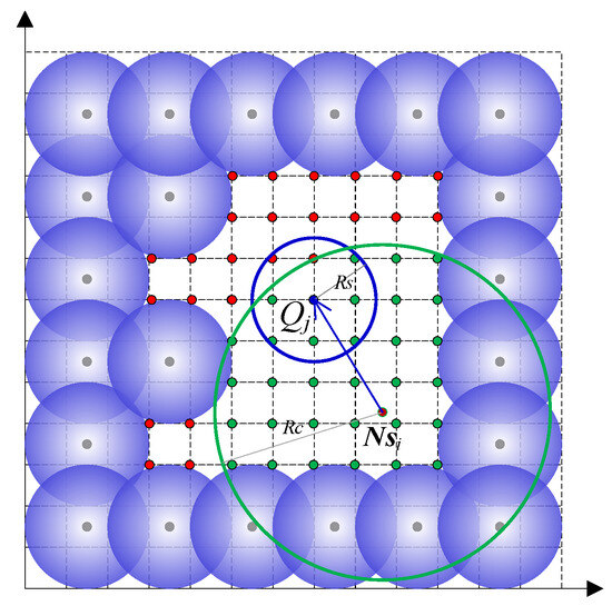 During hole repairing, the mobile node preferentially moves to the hole grid point Qi whose number of neighboring hole grid points is larger than the average value . A higher number of neighbor hole grid points of the hole grid point indicates a larger range of holes in this area and a greater virtual attractive force on the nodes generated by the center of this hole grid points set. Thus, the additional mobile node Nsi within the communication range is attracted to move towards this location so that the node coverage utilization is large. In the later stages of hole repairing, all large holes have been repaired, and the mean value of neighboring hole grid points around the hole grid points has been reduced accordingly. The more neighboring hole grid points Qi has, the farther away it is from the mobile node in the communication range, and the more attractive force it generates. In this way, the nodes are attracted to move quickly towards the larger hole area, always maintaining the optimal coverage utilization of the nodes.