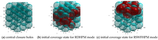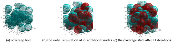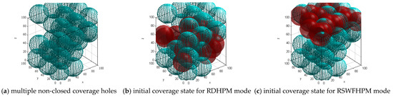 In order to fully validate the performance of the CHRVE algorithm in terms of coverage rate, energy balance, and so on, taking the central closure coverage hole shown in Figure 10a as the scenario, the CHRVE algorithm is compared with 3D-SCHDR [43], 3D-DVFA [42], and 3DSD [41] algorithms, which have been investigated in recent years for 3D coverage and hole repair based on virtual forces. The 3D-DVFA and 3DSD algorithms are redeployment algorithms that require all nodes to be mobile nodes, and, in this paper, the simulation is performed using its virtual force calculation method only for the additional mobile nodes.