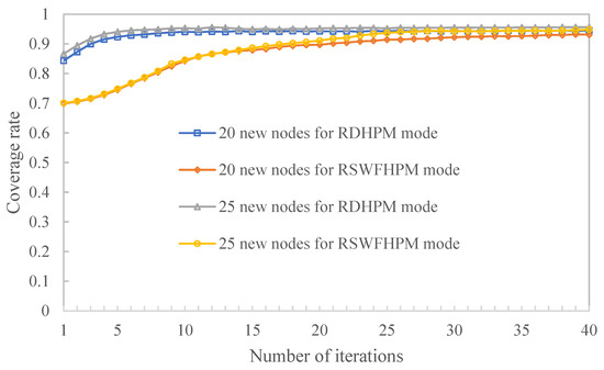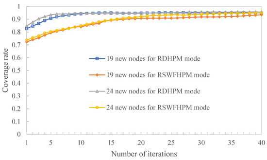 As can be seen from Figure 9 and Figure 11, although the difference in coverage rate between the RDHPM and RSWFHPM patching modes is large at the beginning, this difference in coverage rate between them decreases as the number of iterations increases. Both patching modes can achieve high coverage rates of over 95% after 40 iterations. This validates the robustness of the CHRVE algorithm to the initial position of the additional repairing nodes. Furthermore, when Addmin > Addnode, there is little difference in coverage rate across iterations between the two patching modes. This suggests that after the number of additional nodes has reached the theoretical number of nodes to repair the holes, further additional nodes to repair the holes have a limited effect on further improving the network coverage rate. Therefore, based on the proposed algorithm in this paper, these extra additional nodes can be used for redundant repair of low-energy coverage holes. This redundant repair strategy is used to improve the balance of energy distribution after repairing holes, increase network reliability, and reduce the frequency of coverage holes that occur again when nodes run out of energy in a short period of time.