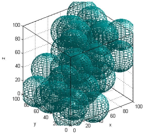 Alam et al. [45] researched 3D network coverage and connectivity problem with the deterministic deployed nodes. In [45], they demonstrated that the truncated regular octahedron requires fewer cells to cover a given 3D space. In this case, , the volume of this truncated octahedron is , and the volume of the circum-sphere is . Therefore, the effective coverage utilization of the node-sensing sphere is up to . In this case, the least number of nodes is required for filling the same volume of space.