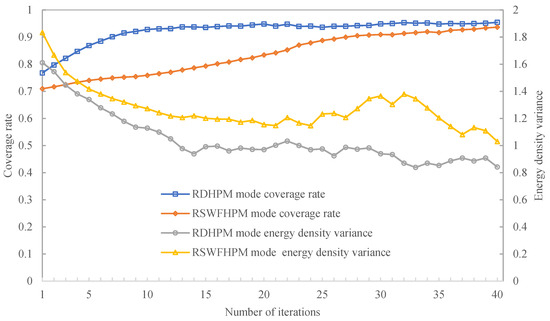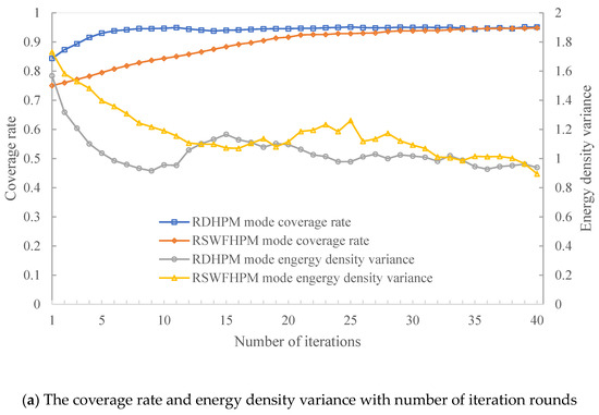 Similarly, for the monitoring area shown in Figure 14a, the 26 additional nodes are deployed with RSWFHPM mode to perform the simulation experiments. Figure 15 shows the variation of node coverage rate and energy density variance with the number of iteration rounds. As can be seen from this figure, with the number of iterations increasing, the overall trend of the energy density variance keeps decreasing while the coverage rate of the two repair modes RDHPM and RSWFPM gradually increases. This validates that, for the case of coverage hole recovery in underwater complex terrain, the redundant repair strategy of the CHRVE algorithm for low-energy coverage holes can also effectively balance the network energy distribution.