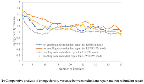 As can be seen in Figure 13a, both patching modes obtain a significant increase in coverage rate as the number of iterations increases. The RDHPM mode converges quickly and achieves a high coverage rate of over 90% in four iterations, and the RSWFHPM mode achieves an over-90% coverage rate in sixteen iterations. The energy density variance, which reflects the energy balance of the nodes in UWSNs, decreases significantly with the increasing number of iterations for both patching modes. Therefore, the redundant repair of low-energy coverage holes by the CHRVE algorithm effectively balances the network energy, which can reduce the frequency of new coverage hole emergence due to node energy exhaustion. Thus, the CHRVE algorithm can guarantee that the network maintains a high coverage rate for a longer period of time and avoids frequent coverage hole repairing. As can be seen from Figure 13b, when Addnode > Addmin, enabling node redundant repair effectively reduces energy density variance compared to not enabling node redundant repair. This furtherly demonstrates that the redundant repair strategy in the CHRVE algorithm can effectively repair low energy coverage holes and balance the network energy distribution.