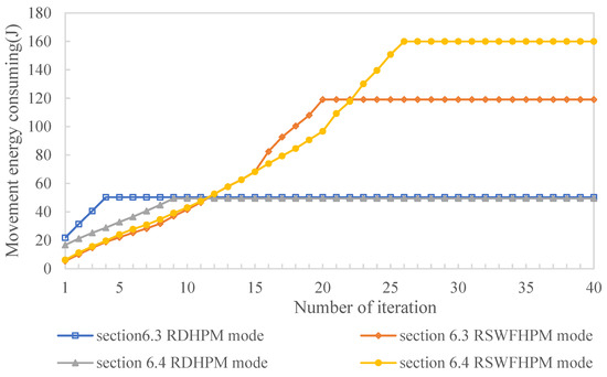 Figure 16 shows the variation of movement energy consumption with the number of iterations by the two patching modes for the examples in Section 6.3 and Section 6.4, respectively, when the number of iterations is 40. Let the algorithm be ended when the preset coverage rate p0 ≥ 92%. Then, for the example of Section 6.3, the hole repairing with RDHPM mode requires four iterations on average to achieve the preset coverage rate. The total movement energy consumption, including the random sinking and each iteration of movement for each mobile node, is 50.3 J. In contrast, the hole repairing with RSWFHPM mode requires 20 iterations to achieve the preset coverage rate, and its movement energy consumption is 119.1J. For the example of Section 6.4, the hole repairing with RDHPM mode requires nine iterations to reach the preset coverage rate, and its total energy consumption is 49.5J. The hole repairing with RSWFHPM mode requires 26 iterations to reach the preset coverage rate, and its total energy consumption is 257.2J.