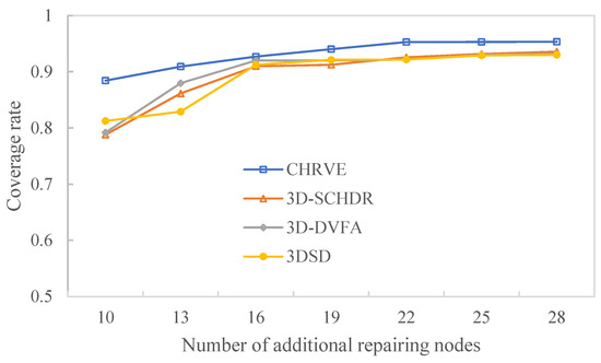 The comparison of coverage rates using each algorithm with different numbers of additional repairing nodes is shown in Figure 17, where the number of additional repairing nodes is incremented from 10 to 28 in steps of three. As can be seen from the figure, the four algorithms have the lowest coverage rate at the minimum number of additional repairing nodes. With the increase in the number of additional repairing nodes, the coverage rate of each algorithm increases gradually, and the coverage performance of the CHRVE algorithm is better than that of the other three algorithms. In addition, when the number of additional repairing nodes is greater than 19, the growth of the coverage rate of the CHRVE algorithm will gradually become flat as the number of additional repairing nodes continues to increase. This is due to the redundant repair strategy of low-energy coverage hole in this paper. In this experiment, Addmin = 20 is calculated with Equation (9). After the number of additional repairing nodes reaches Addmin, the extra additional nodes will be mainly used for redundant repair of low-energy coverage holes, which will have limited effect on further improvement of the coverage rate.