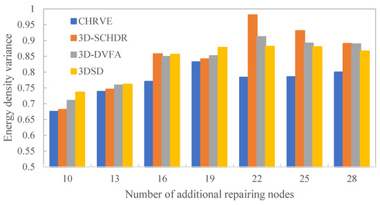 Figure 18 shows the distribution of energy density variance for the four algorithms at different numbers of additional repairing nodes. The energy density variance values of the 3D-SCHDR, 3D-DVFA, and 3DSD algorithms in the figure are calculated after the hole repairing according to Definition 2. As can be seen from the figure, the energy density variance of the CHRVE algorithm is lower than that of the other three algorithms at each number of additional repairing nodes. In particular, the energy density variance of the CHRVE algorithm is even more significantly lower than that of the other three algorithms after the number of additional repairing nodes reaches 19. This is due to the redundant repair strategy of low-energy coverage holes, which guarantees that the hole repair can achieve a good energy balance.