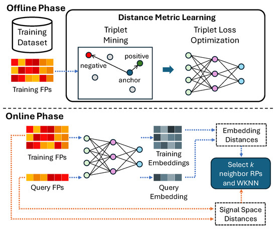In the offline phase, a Siamese network with a triplet loss function is employed to learn a meaningful distance metric from the training FPs. Triplet mining is used during training to select informative triplets—sets of anchor, positive, and negative samples—ensuring that the model learns the effective separation between similar and dissimilar fingerprints. The model is optimized by minimizing the triplet loss to improve its ability to distinguish between nearby and distant locations in the embedding space.
