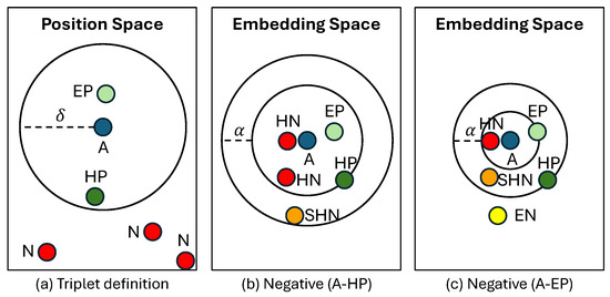 Triplets in the position space and embedding space (A: anchor; N: negative; EP: easy positive; HP: hard positive; EN: easy negative; SHN: semi-hard negative; HN: hard negative).