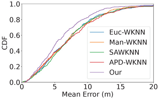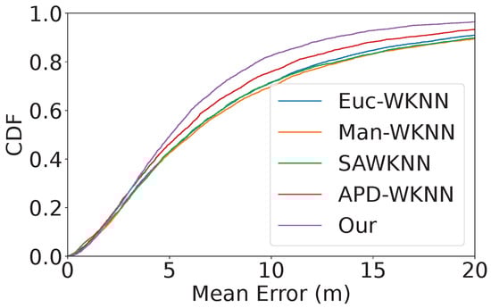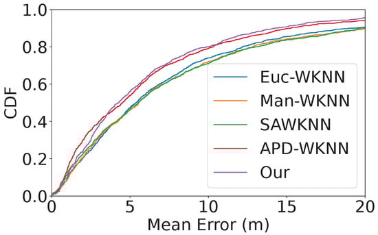 For the UJIIndoorLoc dataset, our method achieves the lowest mean error of 6.53 m, outperforming APD-WKNN at 6.77 m. In contrast, SAWKNN, Man-WKNN, and Euc-WKNN exhibit higher mean errors, with Euc-WKNN reaching 8.68 m. The median error for our method is 4.26 m, indicating consistent performance across the majority of predictions. This is an improvement over APD-WKNN, which has a median error of 4.50 m. At the 90th percentile, our method demonstrates better robustness to outliers with an error of 14.26 m, compared to APD-WKNN’s 15.21 m and SAWKNN’s 19.69 m.