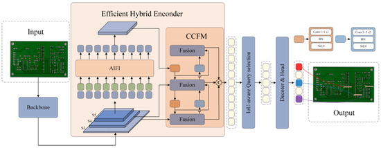In the detection of micro-defects on industrial components, particularly on printed circuit boards (PCBs), various deep learning algorithms have been employed. Notably, the two-stage object detection algorithm Faster R-CNN integrates a Region Proposal Network (RPN) with Fast -RCNN [25]. However, when faced with small target defects, the RPN may struggle to generate effective candidate bounding boxes that adequately cover these defects, leading to a decline in the model’s ability to recognize small anomalies. On the other hand, the YOLO (You Only Look Once) series, which treats object detection as a regression problem, directly predicts bounding box coordinates and class probabilities through a neural network. While this approach shows some effectiveness in identifying small defects, it often requires additional post-processing steps to enhance precision and recall. Such steps can increase computational costs. DETR uses the global self-attention mechanism to solve the post-processing (NMS) operation problem and achieve true end-to-end training and reasoning. However, in practical detection situations, especially within the framework of assembly line applications, algorithms must ensure high accuracy to maintain detection quality and be capable of swiftly processing images to meet the demands of real-time operational efficiency. RT-DETR balances accuracy and real-time responsiveness, combining the feature extraction benefits of a visual Transformer with rapid computation speeds. Additionally, its end-to-end architecture enables swift deployment in industrial settings, making it an optimal choice for PCB defect detection.