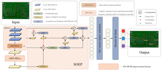 As shown in Figure 2, the model utilizes MDDNet as the backbone for image feature extraction. For the processing of deep network features, we introduced the AIFI-HiLo module, which integrates the HiLo noticing mechanism and is able to extract features at different low-level frequencies to optimize the extraction of critical micro-defect features. We design a neck network called the SOEP. In the first bottom-up final path, the SPDConv module is responsible for extracting small target features from AIFI-HiLo and fusing them at the shallow level of the neck. Meanwhile, CREC collects gradient information from each layer through more efficient connections in the second top-down path. To enhance the focus on PCB micro-defect regions, we utilize an INM-IoU optimized loss function to help the model learn micro-defect features more efficiently. Ultimately, by using a decoder with additional prediction headers, we iteratively refine the object query to generate bounding boxes and confidence scores.