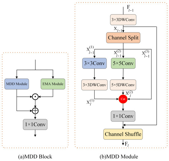 As depicted in Figure 3a, within the MDD block, the MDD module extracts local features. It incorporates the Efficient Multi-scale Attention (EMA) [33] mechanism to enhance the focusing ability of target features and aid the model in better comprehending the relationship between minor defects and their surrounding areas. These two components collaboratively enhance the performance of MDDNet in PCB defect detection.