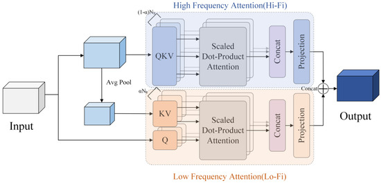 The other model’s low-frequency information is captured by applying attention across local windows. In the HiLo mechanism, the attention layer differentiates high and low frequencies by assigning distinct roles to different heads. As illustrated in Figure 4, in the upper pathway, specific heads are allocated for high-frequency attention (Hi-Fi) through local window self-attention (for instance, 2 × 2 windows), enabling efficient extraction of detailed high-frequency features compared to the standard MSA. Low-frequency attention (Lo-Fi) is established in the lower pathway by using average pooling within each window to extract low-frequency signals. The focus of the remaining attention head is on Lo-Fi, which captures the global relationships between each query position in the input feature map and the average-pooled low-frequency key for each window. This approach greatly reduces Lo-Fi complexity by using shorter key and value lengths. Finally, the refined high- and low-frequency features are concatenated and passed to subsequent layers for further processing.