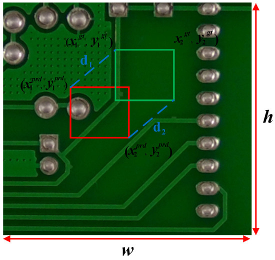 The GIoU in RT-DETR is improved based on the IoU to solve the problem of the gradient disappearing when the un-overlapped area is 0. The GIoU loss function is mainly based on the overlapped area between the predicted and GT boxes to optimize the model. However, regarding PCB defect detection, relying only on the overlapped area may only partially reflect the geometric alignment between the boxes. In this situation, MPDIoU compensates for this by introducing an additional distance metric, i.e., the minimum perpendicular distance between the vertices of the predicted box and the actual box, so that the loss function can pay more attention to the precise alignment of the bounding box during the optimization process. The schematic diagram of the MPDIoU loss function is shown in Figure 6. The expression of MPDIoU is