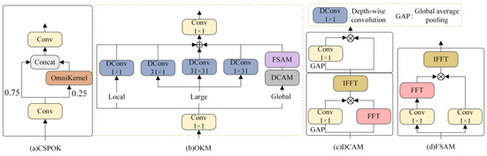 As shown in Figure 7a, the CSP OmniKernel (CSPOK) module follows the idea of the CSP structure, which can enhance the information flow of the network, promote the transmission and learning of features, enhance computational efficiency, reduce module complexity and inference time, and make the model more lightweight and practical. We generate four slices of the input channels, only one of which is processed by the OmniKernel module. In Figure 7b, the OmniKernel (OKM) is shown with the given input feature . Following 1 × 1 convolution processing, the features are directed into three branches—local, large, and global—allowing for effective learning of the feature representation of PCB defects across scales from global to local. The outputs from these branches are subsequently merged using addition and refined with an additional 1 × 1 convolution. Parallel deep convolutions of 1 × K and K × 1 are used in a large branch to obtain bar-shaped contextual information. To mitigate the substantial computational burden associated with large kernel size convolutions, we set the kernel size K to 31. In the inference phase of the global branch, the input image is much larger than the training image. Therefore, a 31 × 31 kernel cannot cover the global domain. To alleviate this issue, dual-domain processing was adopted, which added global modeling capability to the global branch. Specifically, the global branch comprises a dual domain channel attention module (DCAM) and a frequency-based spatial attention module (FSAM), as shown in Figure 7c,d.
