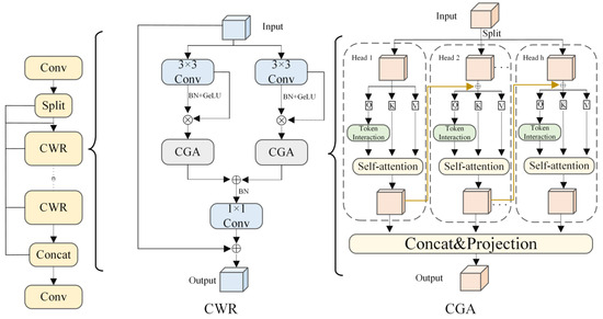 It comprises two convolutional blocks, Batch Normalization (BN) and SiLU activation functions, along with ‘n’ CWR residual modules. However, after slicing operations and residual connections on input tensors , the output undergoes convolution through convolutional layers. This process is depicted by Equation (18).