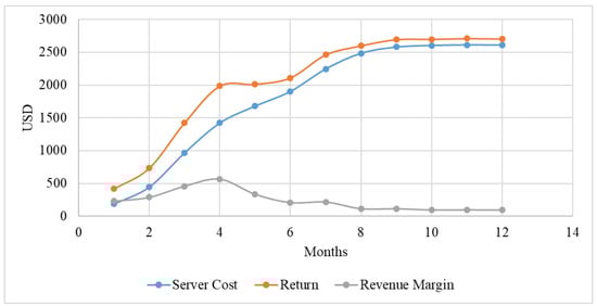 The primary objective of this study is to increase the profit margin. After implementing the proposed RAP-Optimizer, server cost, return, and revenue margin were observed for 12 months. During this observation period, the existing approach and the system with RAP-Optimizer were active simultaneously. The number of users allowed to use the optimized system was kept similar to the existing system for fair comparison. The data observed over the 12-month period are listed in Table 7. After using the RAP-Optimizer, on average, the server cost was reduced by approximately 45%, dropping from an initial USD 2600 to a stable USD 1250 by the 12th month. This resulted in an average monthly cost reduction of USD 1150. In parallel, the profit margin increased from an average of USD 600 per month before optimization to USD 1675 after optimization, reflecting a 179% increase in profit over the 12-month period. Additionally, the reduction in the number of active hosts, as shown in Table 6, led to more efficient resource utilization, ensuring that the same number of API requests were handled with fewer servers, further driving operational cost savings and profit maximization.