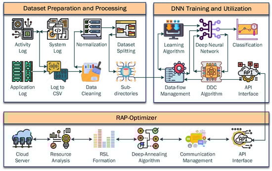 The overview of the proposed methodology is illustrated in Figure 2. It starts with dataset processing, constructed from the experiment’s AIaaS application log files. Later, a well-optimized DNN architecture is developed to predict the appropriate configuration for a service request. After that, an innovative approach of reducing the overfitting effect and shifting to balance learning is incorporated into the network during the training process. The trained DNN was used to develop the RAP-Optimizer, which consists of a resource analysis module, resource space landscape, and a novel deep-annealing algorithm.