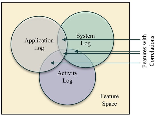 This study uses a unique dataset prepared from the AIaaS application log and a sample of the dataset is presented in Table 2. The application maintains three types of log files, which are the activity log (), system log (), and application log (). The relationships among these logs are illustrated in Figure 3. The keeps track of the user interaction, is responsible for keeping track of computational resource usage, and is dedicated to application-related data. All data from these logs are converted into comma-separated value (CSV) format [34]. After that, the instances are categorized into five classes as presented in Table 2. The Pearson correlation coefficient (PCC) score, calculated using Equation (1), was used to identify the relevant features that have a strong correlation with the five classes [35].