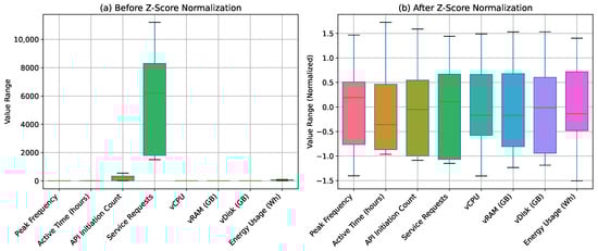 The feature variables exhibit a wide range of variations in the dataset, so feature normalization is essential [38]. Z-score normalization was chosen to normalize the features because it effectively handles data with varying scales and distributions. Figure 4 illustrates the difference in data range before and after performing the normalization. The Z-score normalization process for a feature is defined in Equation (4) [39].