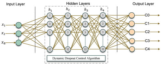 A deep neural network (DNN) was designed as the resource predictor of the proposed RAP-Optimizer. It is a six-layer network designed using the concept of a fully connected network architecture. It is illustrated in Figure 5. There are a total of four hidden layers. Including the input and output layers, the overall network is a six-layer network. The input layer supports an 8-dimensional feature vector defined as . The hidden layers in Figure 5 are expressed by , , , and . Each layer has 32 neurons, which allows the network to intercept complex representations of the data. The network architecture was carefully designed to predict the cloud configuration requirements when AIaaS applications are initiated. The optimal dropout rate plays a crucial role in ensuring the reliable performance of the network. That is why an innovative dynamic dropout control (DDC) algorithm was prepared in this study. It was designed and integrated with the network to adjust the dropout rate of each layer dynamically for optimal unbiased performance. The working principle of the input layer is expressed by Equation (5). The input layer simply transposes the input vectors [42].