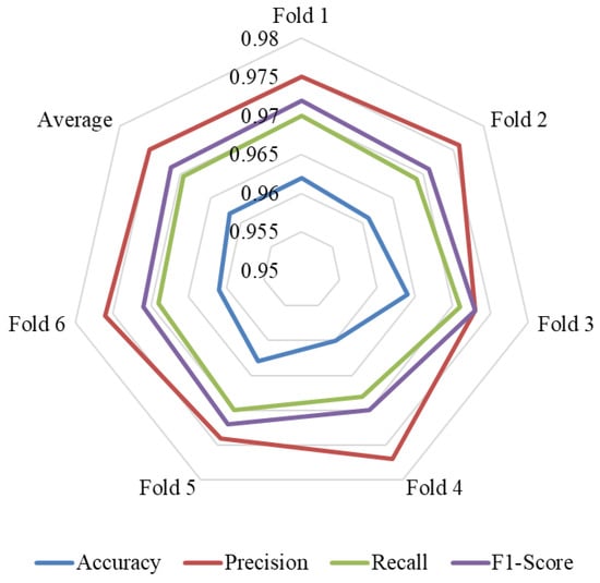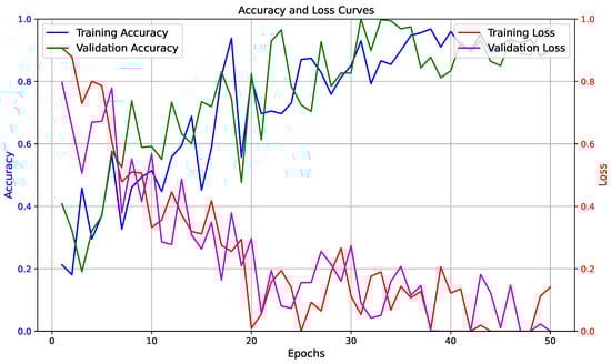 The training dataset contains 99,948 instances. To enhance training efficiency, mini-batches of size 64 are utilized. The learning curve, depicting the progress of both accuracy and loss for training and validation, is presented in Figure 6. It showcases the network’s performance over 50 epochs with 111,550 iterations, taking approximately 8 h and 27 min to complete. The validation accuracy achieved is 97.48%, with a validation loss of 2.82%, while the training accuracy and loss are 95.15% and 4.85%, respectively.