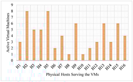 The RAN algorithm returns the RS and RT, where the VM configurations, current resource consumption rate, IDs of the VMs (), corresponding physical hosts, and other relevant data are available. These data are used to prepare the RSL, showing active VMs in physical hosts. The RSL of a random instance is illustrated in Figure 7. The data center offering the AIaaS consists of 16 physical hosts in each server rack. The experimental environment has 3 server racks. According to the organization’s policy, a maximum of 10 VMs are allowed concurrently in a single host to maintain the terms of services (TOS). Each physical host is powered by a 10-core CPU with 128 GB primary memory.