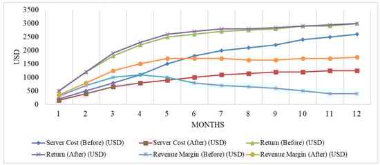 Despite the optimization, the application’s return remained consistent, showing that user demand and subscription revenues were unaffected by the changes. The table highlights a clear increase in the revenue margin after optimization—from an initial margin of USD 300 in the first month, the margin grew to USD 1750 by the 12th month. This improvement demonstrates the effectiveness of the proposed system in reducing operational costs while maintaining consistent service delivery, thus ensuring the profitability and sustainability of the AI-driven image enhancement web application over time. By efficiently managing resources and reducing the number of active hosts, the system successfully increases profit margins, even as server usage grows.