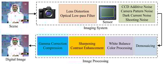 Lighting conditions are crucial in determining the external imaging environment of videos, as they reflect the actual physical conditions during the imaging process. Despite advancements in computer graphics and generative models, accurately replicating real-world lighting remains a significant challenge. The imaging process of digital images, as depicted in Figure 1, involves several key components: the lens system, sampling filters, color filter arrays, imaging sensors, and digital image processors. Among these, the imaging sensor is the core component. When the camera shutter is activated, light from the natural scene traverses the lens, optical filters, and color filter arrays before reaching the imaging sensor. The sensor then converts the captured light into electrical signals via the photoelectric effect. An analog-to-digital (A/D) converter then digitizes these signals. The digital signals undergo further processing by the digital signal processor (DSP), which performs tasks such as white balance adjustment, image sharpening, gamma correction, and data compression. The final image is then stored in the camera’s memory or displayed on the screen. In contrast, Figure 2 illustrates the process of image generation using GANs [11,12]. In this framework, the generative model creates samples based on a given random variable, while the discriminative model endeavors to differentiate between real and generated samples. Adversarial training continuously refines both models: the generative model aims to produce samples indistinguishable from real data, while the discriminative model increasingly struggles to differentiate between them.