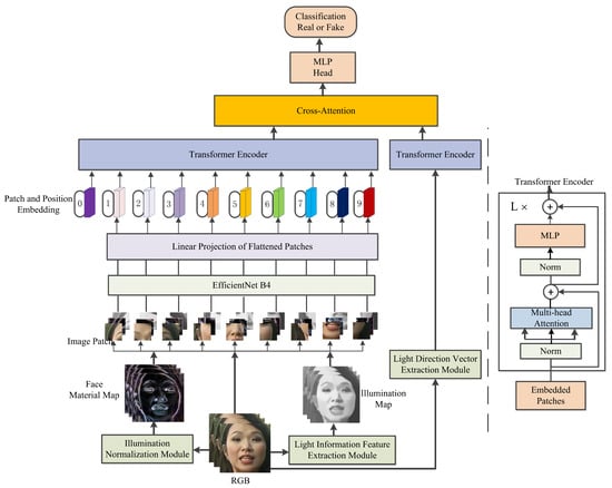 Several studies [14,16,17] have demonstrated that real videos maintain stable and consistent lighting components throughout the recording process, whereas forged videos exhibit lighting components generated by artificial lighting models. These models, due to their limited simulation capabilities and the frame-by-frame generation process, often result in unstable inter-frame lighting components in forged face videos. We propose a method to decompose images and extract lighting inconsistency features, enabling the distinction between real and fake videos. Our approach involves enhancing and amplifying lighting inconsistencies that reflect imaging differences between real and fake images. However, some lighting information introduces environmental interference, which can reduce cross-domain detection performance. To mitigate this, we suppress and reduce such lighting information to extract more fundamental tampering traces. To effectively capture lighting inconsistency information during the imaging process, we design a lighting information feature extraction module based on the principle of color constancy. To minimize the impact of lighting changes, we incorporate a face material property feature extraction module based on PLGF. This module selectively processes different image patterns using predefined convolutional masks to filter out lighting components, resulting in face material property features related to the reflectance coefficient. These features, rich in texture information, serve as effective indicators for forgery detection. Furthermore, we employ the Lambertian lighting model to derive lighting direction vector maps across different frames, providing auxiliary information in the temporal domain. To enhance detection generalization performance, we design a multimodal learning method that integrates CNN (EfficientNet B4) and Vision Transformer (ViT). This method utilizes RGB images, face reflectance coefficient maps, lighting feature maps, and lighting direction vector information as inputs from different modalities. By employing a cross-attention fusion strategy at the feature level, our approach effectively combines these inputs. Figure 3 illustrates the architecture of our method.
