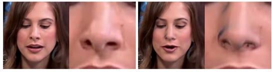 - Rossler, A.; Cozzolino, D.; Verdoliva, L.; Riess, C.; Thies, J.; Nießner, M. Faceforensics++: Learning to detect manipulated facial images. In Proceedings of the IEEE/CVF International Conference on Computer Vision, Seoul, Republic of Korea, 27–28 October 2019; pp. 1–11. [Google Scholar]