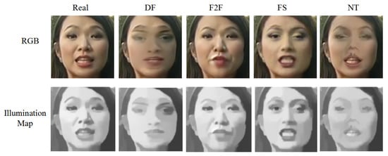 Based on Equations (1)–(3), we obtained the illumination information of the facial regions in real images and four forgery methods from the FF++ database [45] for the same frame. Figure 6 illustrates the visualization of these illumination maps.