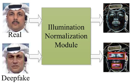 The process outlined above underscores the significant differences in the external imaging environment between real and computer-generated images, which can be leveraged to identify distinguishing clues between genuine and fake images. Matern et al. [13] focused on detecting Deepfake videos by analyzing artifacts such as facial distortions and lighting changes during facial tracking and editing. The strength of this method lies in its minimal requirement for training data, as it targets common artifacts in the forgery process. However, it may encounter difficulties with meticulously crafted Deepfake videos that minimize these artifacts during generation. Li et al. [14] introduced a face-swapping video detection method based on lighting direction consistency. This approach calculates the two-dimensional lighting direction in videos and assesses the smoothness of lighting direction angle changes, offering low computational complexity and good real-time performance. Nonetheless, it is sensitive to variations in lighting conditions, which can adversely affect detection accuracy. Gerstner et al. [15] described a real-time Deepfake detection technique that employs active illumination to induce controlled changes in the user’s facial appearance. While this method facilitates real-time detection, it necessitates specific hardware and is vulnerable to video compression and post-processing effects. Wu et al. [16] developed a Deepfake detection algorithm based on block-wise lighting inconsistency. This method improves detection accuracy in forged videos by fusing channels to provide more lighting inconsistency information to the network’s feature extraction layer, enabling block-wise similarity comparisons. However, it requires substantial computational resources and exhibits a higher false positive rate when processing non-forged videos. Zhu et al. [17] proposed a method to detect Deepfake videos by reconstructing and enhancing inter-frame inconsistencies, including lighting, color, and motion. This technique excels with complex video content but may lose accuracy when confronted with highly advanced forgery techniques. While these methods effectively utilize lighting inconsistency information for Deepfake detection, they often neglect the influence of environmental factors during filming. The lighting-related information that differentiates real from fake images can be significantly affected by varying shooting environments across different datasets, thereby impacting the generalization performance of detectors.
