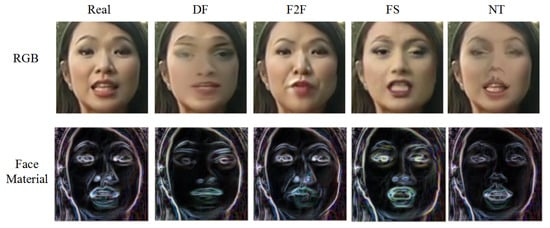 By processing through the aforementioned illumination normalization module, we can obtain face material maps that are solely related to the reflectance coefficient. As shown in Figure 7, features rich in texture information effectively indicate forgery. The figure demonstrates that the eye and mouth regions of the face image exhibit more noticeable abnormal traces. This heightened visibility is attributed to the increased difficulty in forging these specific areas. Figure 8 visualizes face material maps for facial regions in real images and those altered by four forgery methods from the FF++ database [45], all for the same frame.