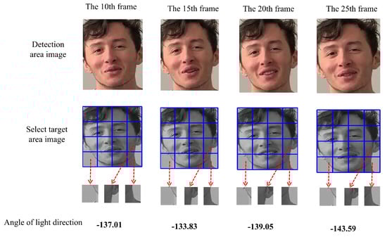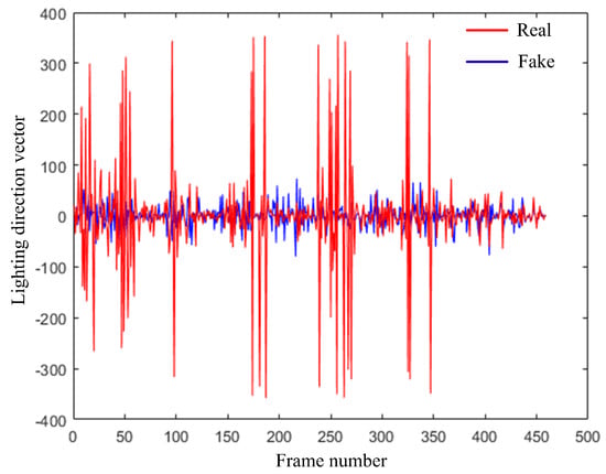 Figure 11 shows the calculation process of the lighting direction. As shown in Figure 12, the intermediate results of the algorithm are demonstrated using frames 15, 20, 25, and 30 from the real video 1061402_A_001 in the DFDC database [46]. To assess the feasibility of estimating lighting direction vectors for detecting video forgeries, we conducted a preliminary statistical analysis using real and forged videos from existing public datasets. We assume that for short videos lasting several seconds, the lighting conditions in the shooting environment remain constant. Consequently, in naturally shot real videos, the lighting direction between adjacent frames tends to exhibit consistent patterns. In contrast, forged face-swapping videos are typically created by re-encoding sequences of independently altered video frames, which disrupts the natural alignment of lighting directions between adjacent frames. Therefore, significant variations in the lighting direction angles across a sequence of video frames may indicate potential forgery. When the calculation of lighting direction is confined to the facial area, such variations can specifically suggest a face swap operation. To validate the algorithm’s effectiveness, we selected a real video consisting of 450 frames and its corresponding forged face-swapping version. We analyzed the distribution of their lighting direction angles, with the results depicted in Figure 13. As illustrated in Figure 13, the lighting direction angles in the real video change smoothly over time, whereas those in the forged video exhibit more abrupt fluctuations. This contrast supports the hypothesis that inconsistencies in lighting direction can serve as an indicator of video manipulation.