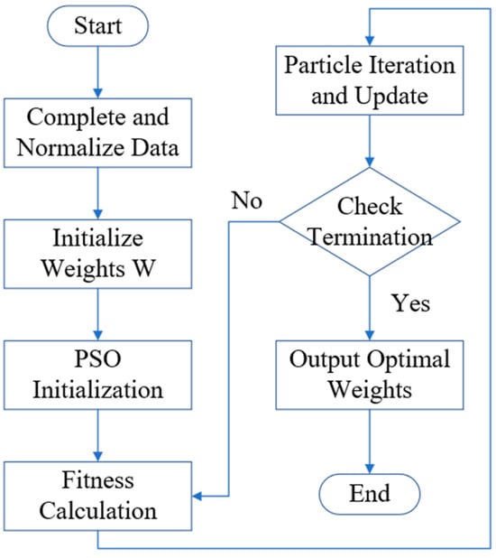 (3) Particle swarm optimization initialization: A set of s particles is used to initialize the PSO. Each particle is represented by a position vector , with its initial positions corresponding to the weight vector . The initial velocities are randomly assigned values within the range [−0.002, 0.002], allowing the exploration of the solution space;