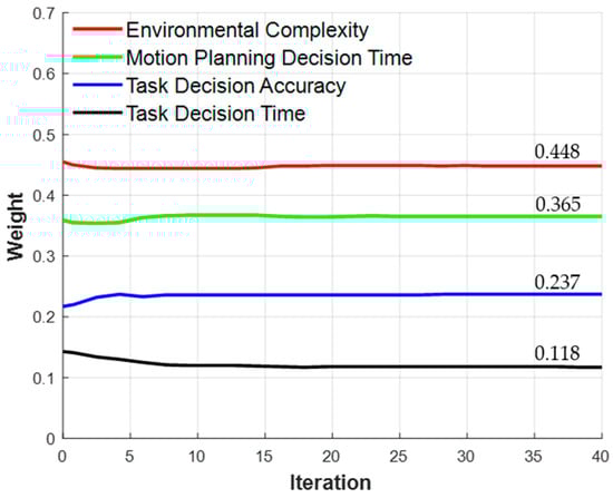 The updated evaluation weights are shown in Figure 4, illustrating the optimization process of obtaining the ideal weights for four indicators through 40 iterations. The optimized weights (0.365, 0.448, 0.118, 0.237) were applied to the original system to recalculate the field exploration robot’s environmental understanding capability, using the data from Table 2.