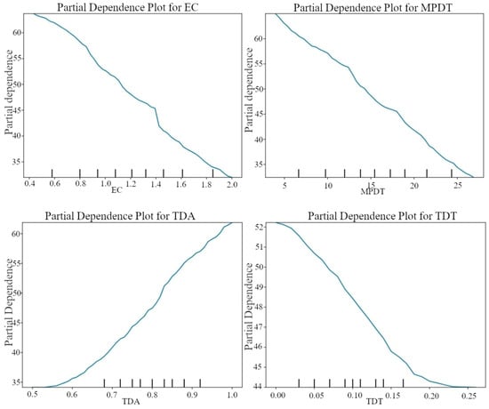 In Figure 6, the interpretability results of the experimental PDP are shown. We can observe that environmental complexity (EC), motion planning decision time (MPDT), and task decision time (TDT) have negative impacts on the field detection capability of outdoor exploration robot systems, whereas task decision accuracy (TDA) has a positive effect. Additionally, by examining the range of values on each graph’s x-axis and y-axis, we find that EC has the greatest vertical span, followed by MPDT, with TDT having the smallest vertical span, consistent with the weight ratios optimized through the method proposed in this paper.