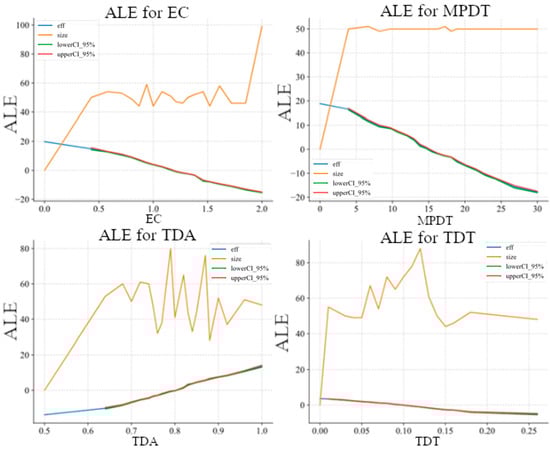 - Global interpretability methods: Based on the entire dataset, these methods analyze the impact of each feature on the output results of the black-box model, identifying which feature or features have the greatest impact on the model’s output results. Common global interpretability methods include Partial Dependence Plots (PDPs) [] and Accumulated Local Effect (ALE) plots []. PDPs show the impact of a feature on the model’s prediction results, assuming other features remain unchanged. It calculates the average impact of different values of a feature on the model’s prediction, given that all other features are fixed, thus revealing the relationship between a specific feature and the prediction result, helping to understand how the model uses that feature for predictions. It is intuitive, but may be misleading in the presence of high feature correlations. ALEs, by calculating the local effects of a feature at different values and accumulating them across all sample points, shows the feature’s impact on the model’s prediction results. ALEs consider the correlation between features, avoiding the potential misleading results of PDPs, making it suitable for handling data with high feature correlation, providing more reliable explanations. However, compared to PDPs, their calculations and interpretations are more complex;