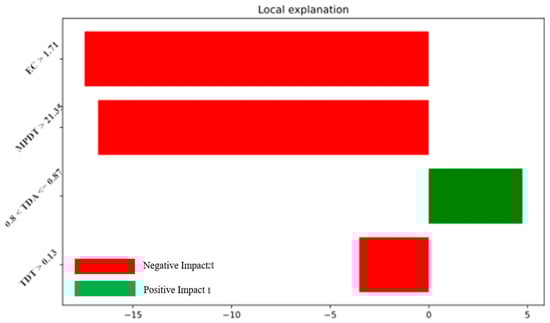 We randomly selected a sample from Table 2 with EC, MPDT, TDA, and TDT values of 1.71, 21.35, 0.83, and 0.14, respectively. The LIME interpretability verification results are displayed in Figure 8. In this figure, red indicates a negative impact on the robot’s planning and decision-making capabilities, while green represents a positive impact. The length of each bar reflects the degree of influence on planning and decision-making output, with longer bars indicating a greater influence. Specifically, MPDT, EC, and TDT negatively impact the planning and decision-making capabilities’ output, whereas TDA had a positive effect. Among these, EC exerted the most significant influence, followed by MPDT, with TDT having the least impact. In conclusion, the interpretability results aligned well with the optimized weighting of the evaluation indicators designed in the proposed evaluation system.
