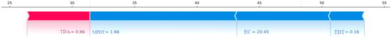 We randomly selected a sample corresponding to Table 2, with TDA, MPDT, EC, and TDT values of 1.66, 20.45, 0.86, and 0.16, respectively. The interpretability verification results obtained via LIME are shown in Figure 9, with the SHAP values in the figure output. A red SHARP means that the indicator has a positive impact on the perceived output of the environment, while a blue one means that it has a negative impact on the perceived output of the environment; and the length of the SHARP value represents the degree of impact on the planning and decision-making output of the environment. The longer the bar, the greater the degree of influence. The experiment showed that TDA has a positive impact on the planning and decision-making capabilities’ output, while the other three indicators had negative impacts. Additionally, EC had the largest impact, and TDT had the smallest impact. The obtained results are consistent with the aforementioned interpretability analysis results and expectations, further demonstrating the reliability of the optimized evaluation system designed.