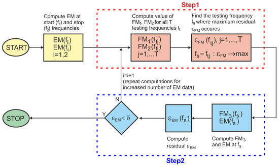 A block diagram of the algorithm is shown in Figure 1. Initially, the samples and are computed by the MoM. The frequencies and determine the frequency range of the analysis. This is the starting point for the iterative algorithm divided into the previously mentioned two stages: