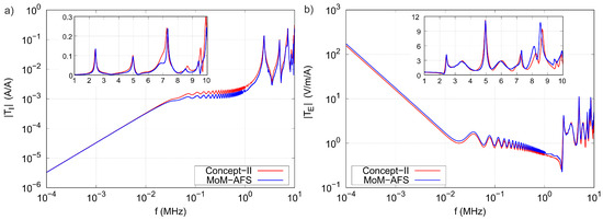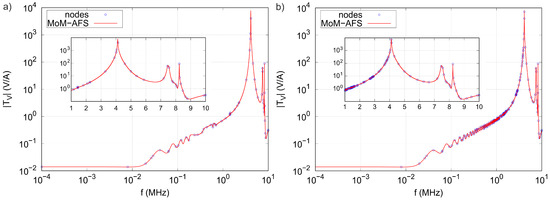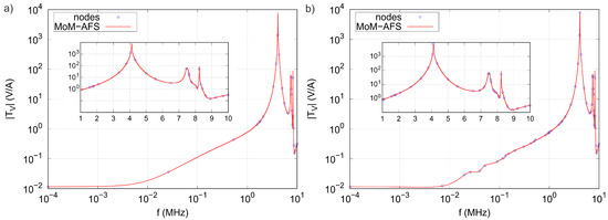 Figure 4 shows the frequency characteristics of the load current transmittance and the electric field transmittance . When determining , the voltage in (13) is replaced by the current flowing through the load of 30 . Similarly, when determining , is replaced by the electric field determined at the observation point P(20 m, 20 m, 1.5 m) in the center of the loop (see Figure 3). The analysis is performed in the frequency range from 100 Hz to 10 MHz. For the proposed algorithm, the convergence error is assumed and the test frequencies are uniformly distributed throughout the frequency range with the step size set at 100 Hz. For clarity, the results are shown on a logarithmic scale with an additional inset plot on the linear frequency scale that reveals the details of the transmittance above 1 MHz. As one can notice, the results obtained with the implemented algorithms (labeled MoM-AFS) are in very good agreement with the reference results obtained with Concept-II and those presented in [55]. During the analysis, exactly the same numerical model of the LPS is used by Concept-II and by the in-house developed MoM code. The numerical model is prepared according to the discretization rules presented in the user manual of Concept-II.